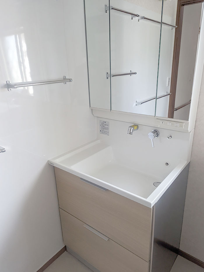 洗面化粧台横の壁にパネルを張り、清掃性を高めました。